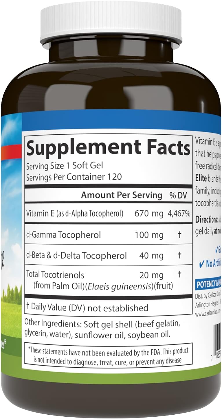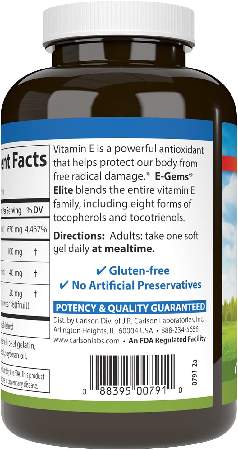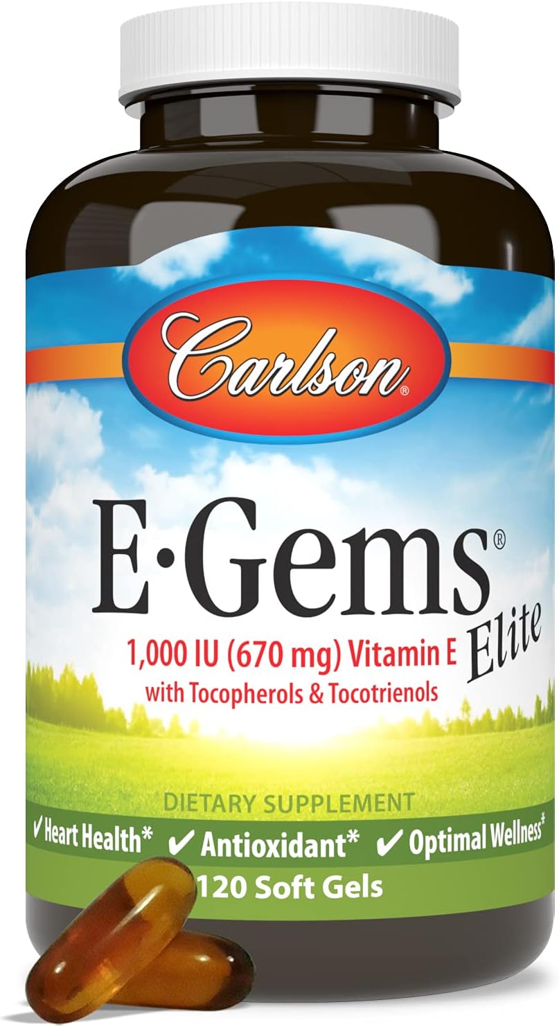 Carlson - E-Gems Elite, 1000 IU Vitamin E with Tocopherols & Tocotrienols, Heart Health & Optimal Wellness, Antioxidant, 120 soft gels