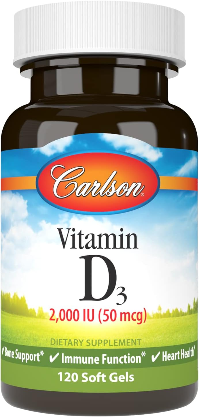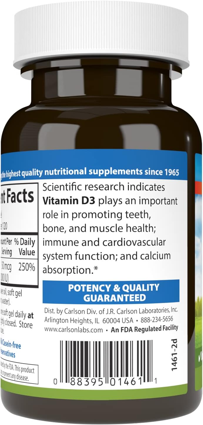 - One 120 count bottle of carlson vitamin d3 2,000 iu dietary supplements
