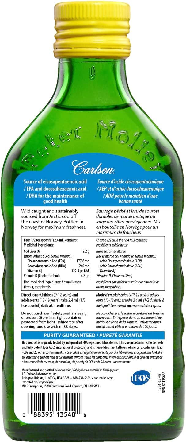 Carlson - Cod Liver Oil Gems, 460 mg Omega-3s + Vitamins A & D3, Wild-Caught Norwegian Arctic Cod-Liver Oil, Sustainably Sourced Nordic Fish Oil Capsules, Lemon, 150 Soft Gels