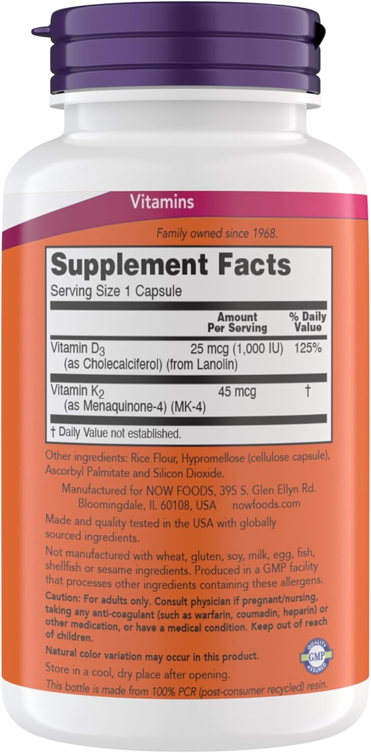Now Supplements Vitamin D3 K2, 1,000 IU/45 mcg, Cardiovascular Support, Supports Bone Health, 180 Vegetarian Capsules - Vegan, Gluten Free, Kosher Vitamin D3 and K2 Supplements