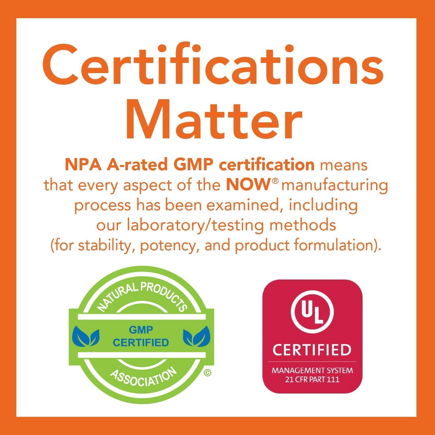 - GMP Quality Assured: NPA A-rated GMP certification means that every aspect of the NOW manufacturing process has been examined, including our laboratory/testing methods (for stability, potency, and product formulation)