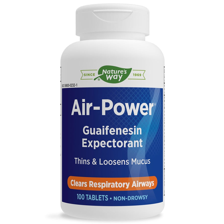 When is an expectorant useful?Whenever you need bronchial support.As we all know, chest congestion can hit any time of the year. Having a convenient expectorant handy when you need clear bronchial airways lets you breathe easy at the office, or a day at the park.Why use Air-Power?It clears bronchial airways and helps loosen phlegm.Air-Power contains the active ingredient glycerol guaiacolate, in a base of herbs and other ingredients. This formula helps make coughs more productive by helping loosen excess phlegm (mucus) from respiratory airways due to bronchial irritations.It's convenient.Because Air-Power is a tablet, there's no fuss. Plus, you don't have to worry about a bottle that can leak all over your backpack or bag. It can be used by the whole family.