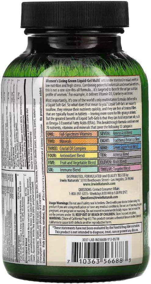 Irwin Naturals Women's Living Green Liquid-Gel Multi Vitamin - 90 Liquid Softgels - 70 Essential Nutrients, Full-Spectrum Vitamins, Wholefood Blend - Targeted Adrenal & Brain Support-30 Total Servings