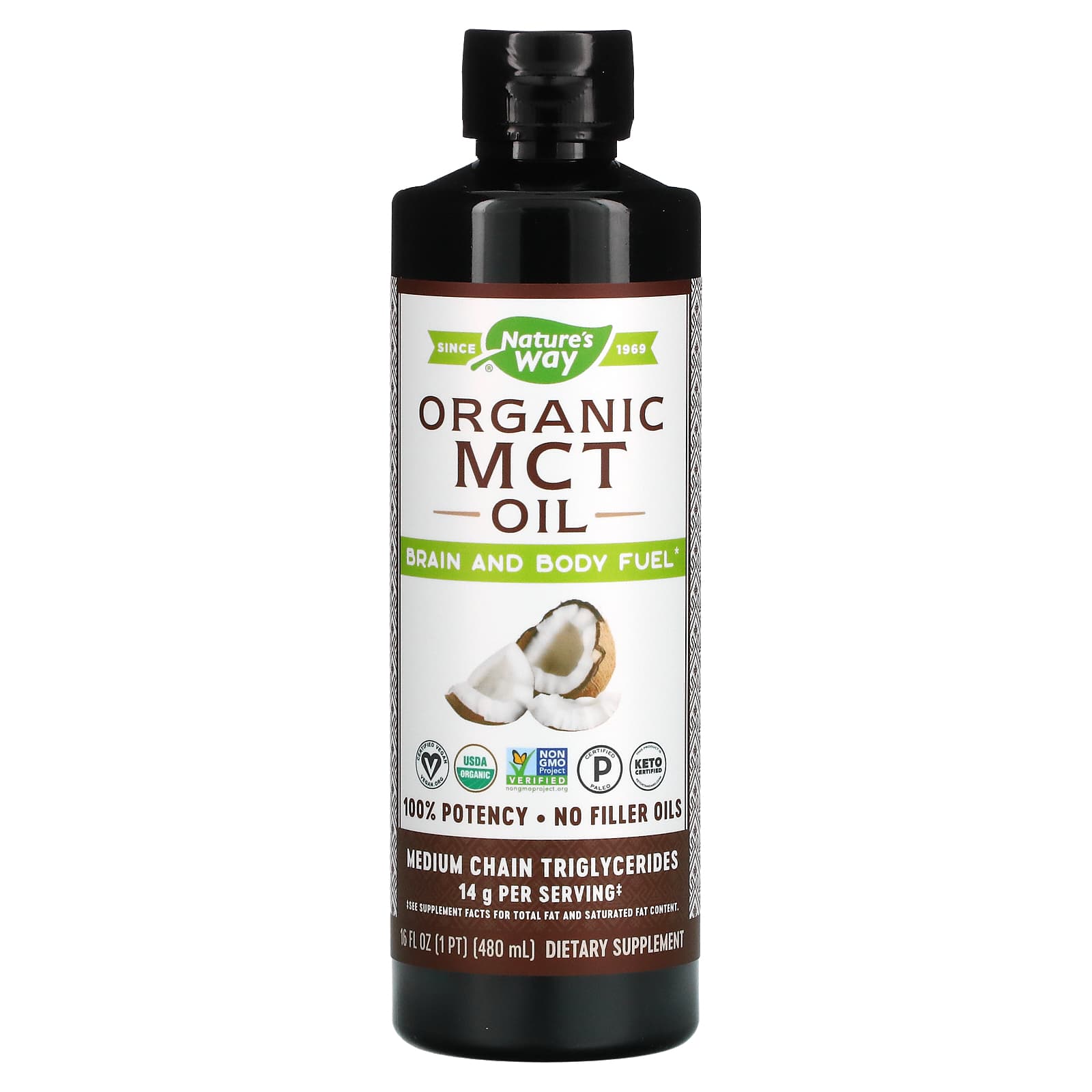 100% MCTs14g MCTs per servingCertified OrganicNon-GMO Project VerifiedColorless, odorless and flavorlessSee Supplement Facts for total fat and saturated fat contentWide-ranging Benefits of MCTsBrain and body fuel*Quickly digested and converted into energy*Helps you to feel full* Premium quality & pure sourceNo palm or filler oilsHexane-freeGluten-freePaleo-Certified, Keto & Vegan-Certified