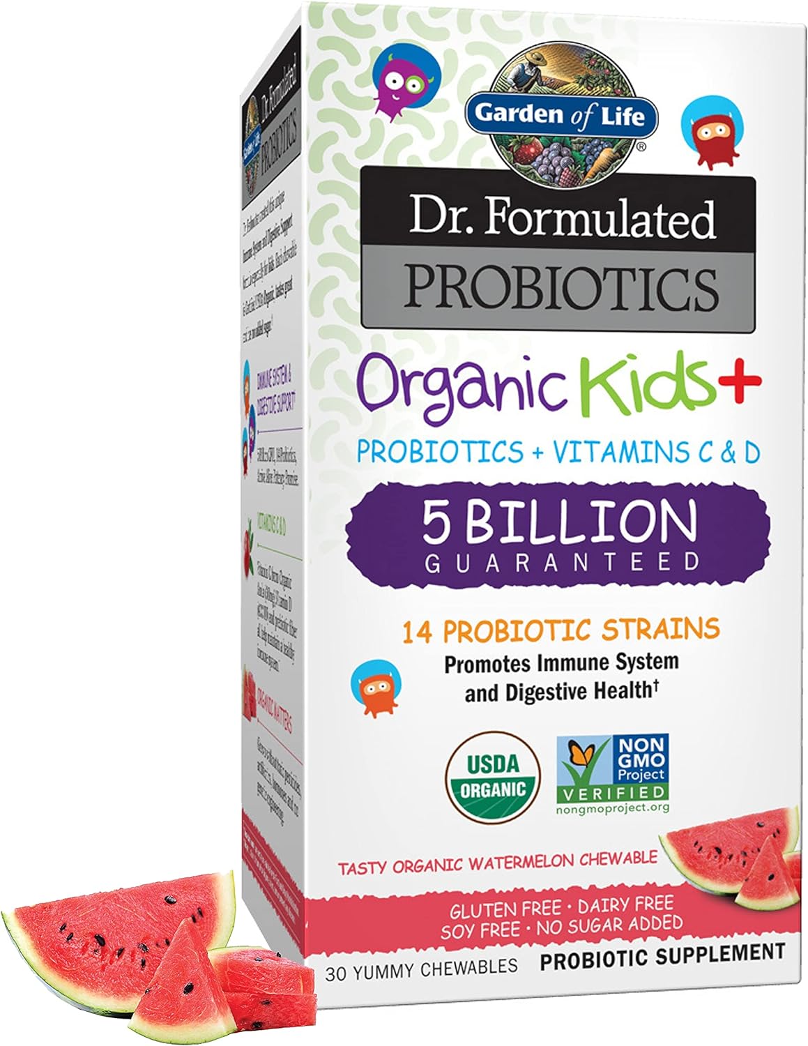 Garden of Life Dr. Formulated Probiotics Organic Kids+ Plus Vitamin C & D - Watermelon - 5 Billion CFU Gluten, Dairy & Soy Free Immune & Digestive Health Supplement, No Added Sugar - 30 Chewables