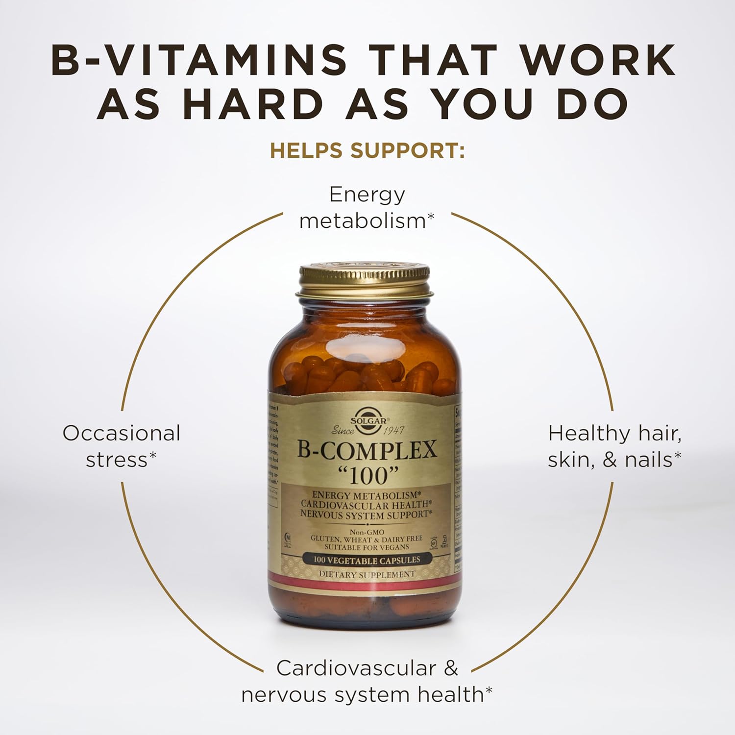 - Helps convert food into energy; Solgar B-Complex 100 Vegetable Capsules provide the B Complex vitamins your body needs for the metabolism of carbohydrates, fats and proteins into energy