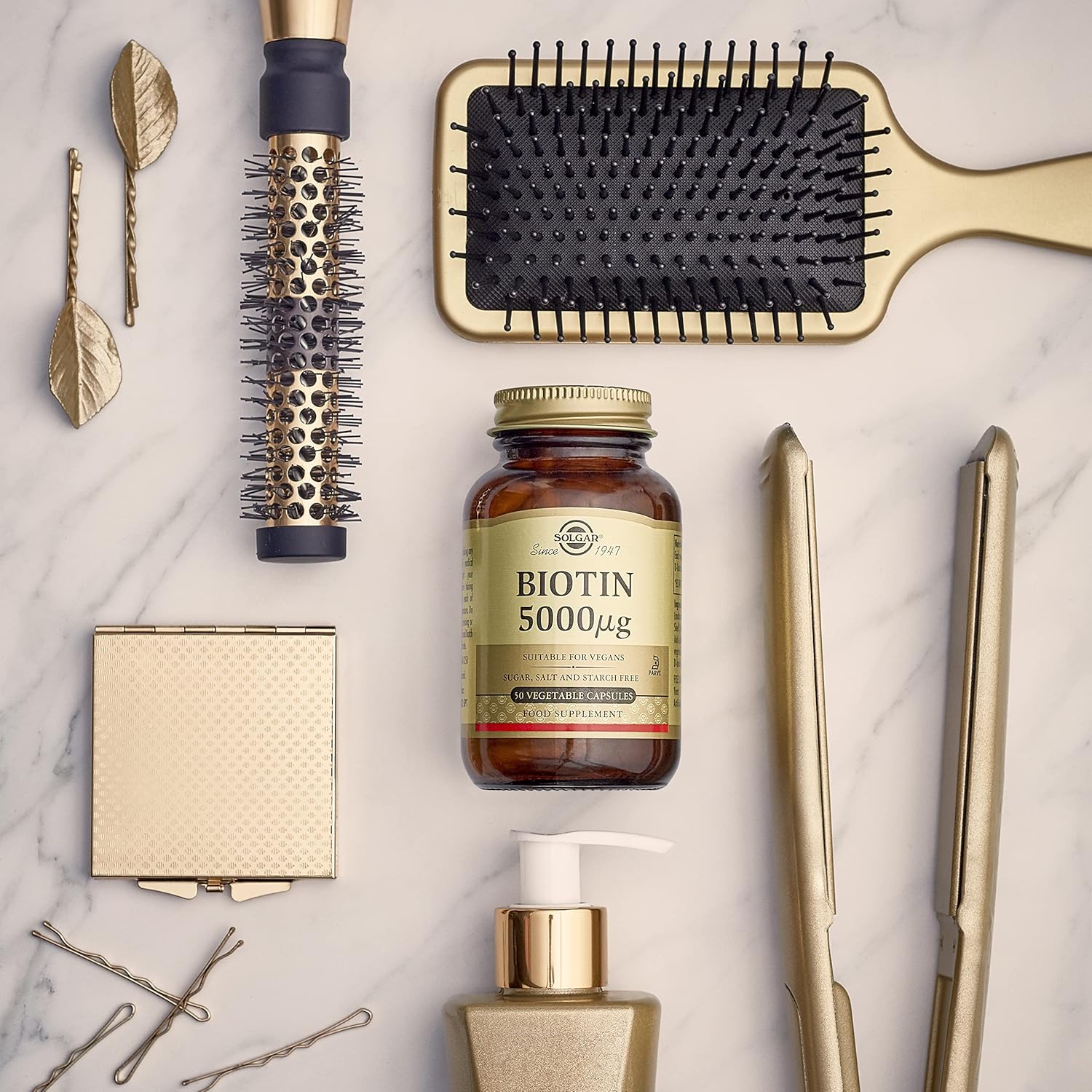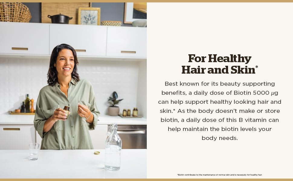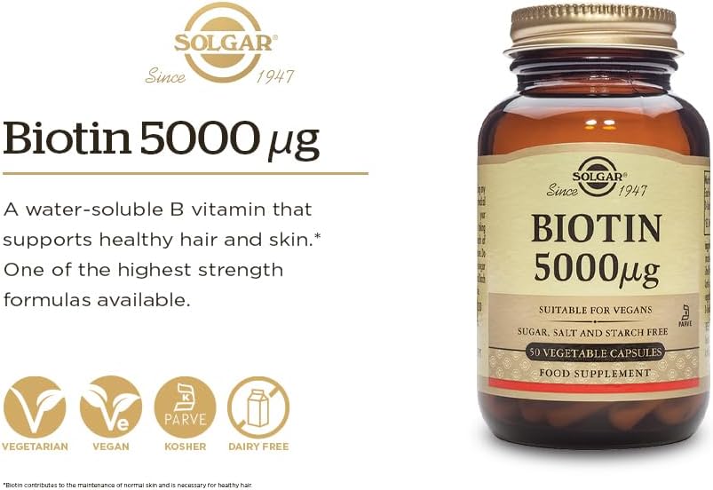 - Solgar Biotin 5000mcg Helps Support Healthy Hair, Nails, And Skin; Biotin is necessary for certain enzymes to work properly; These hair, skin, and nails vitamins for women and men alike provide beauty supporting benefits