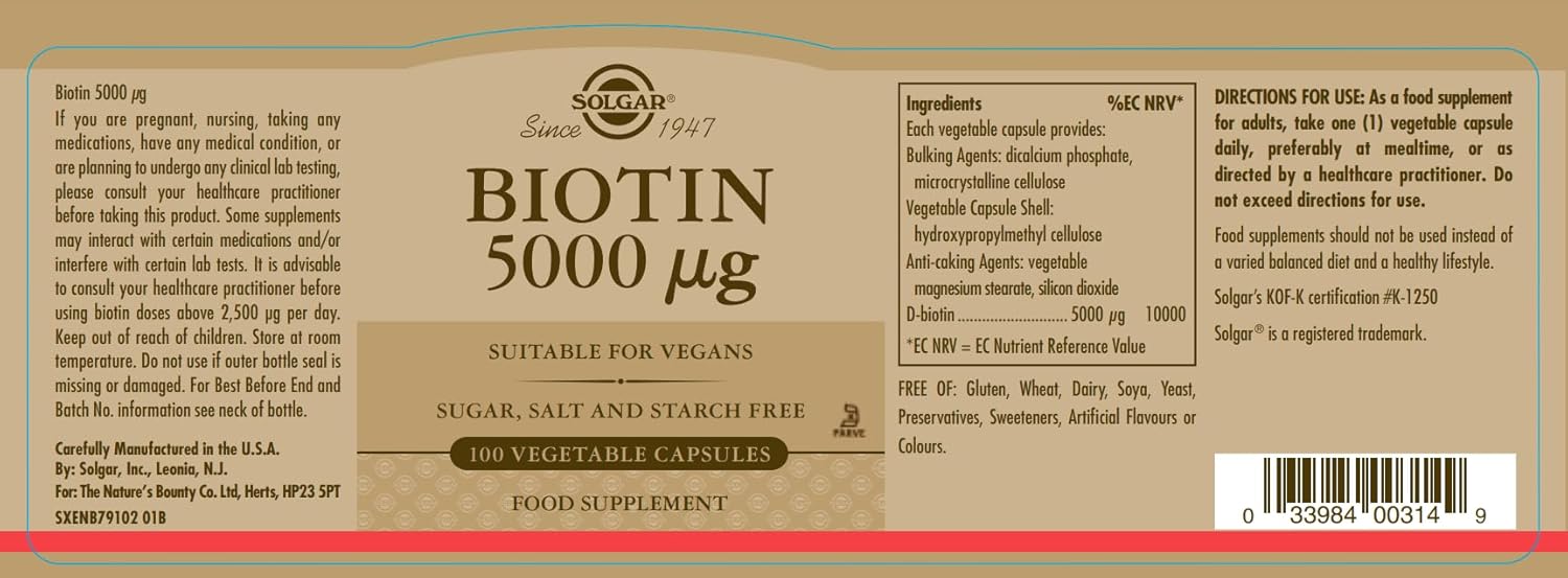- Non GMO And Gluten Free; Solgar Biotin Vegetable Capsules are suitable for vegans; Free of: gluten, wheat, dairy, soy, yeast, sugar, sodium, artificial flavor, sweetener, and color