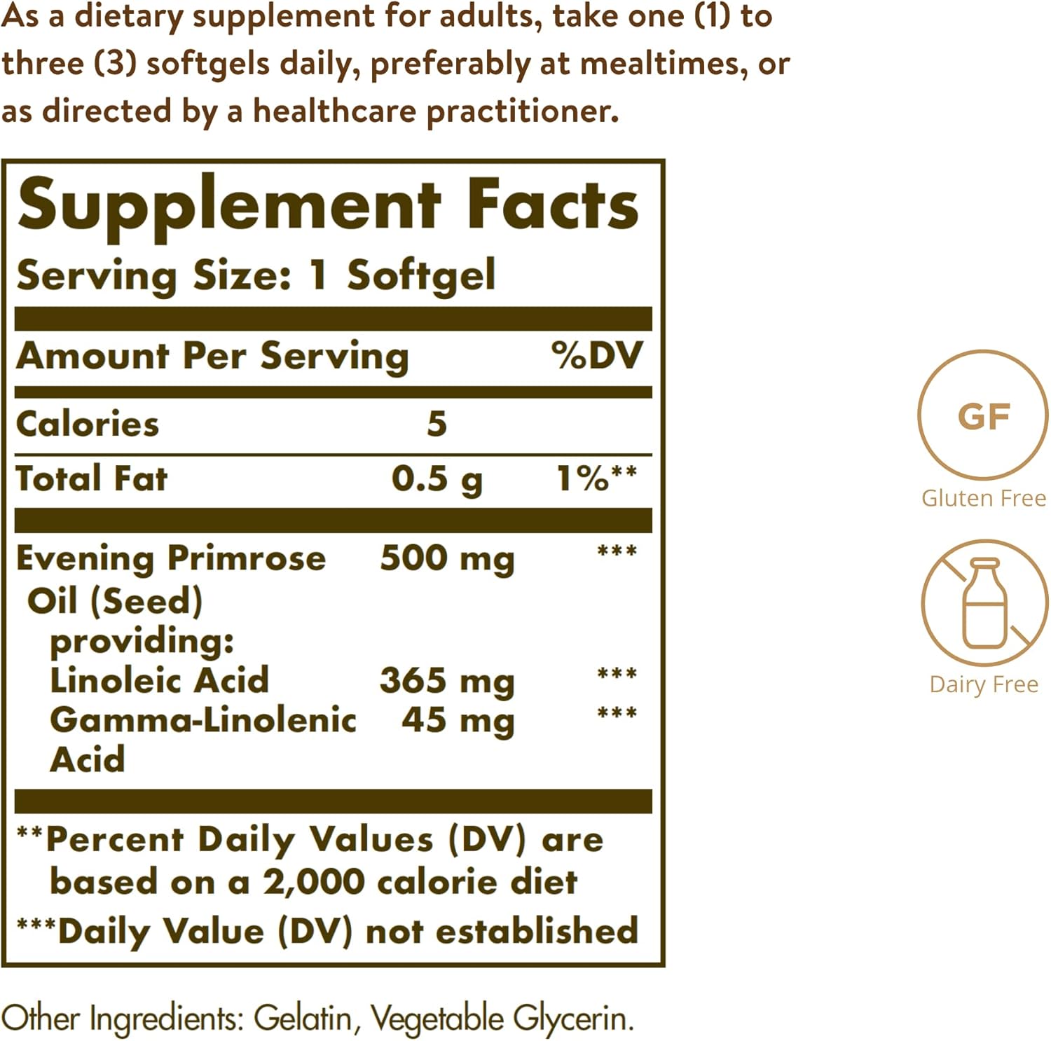 Clean and Free from Allergens: Solgar's Evening Primrose Oil is free from gluten, wheat, dairy, soy, yeast, sodium, artificial flavors, sweeteners, preservatives, and colors.