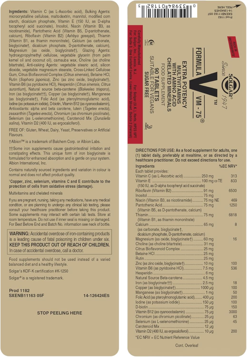 Solgar Formula VM-75, 90 Tablets - Multivitamin with Chelated Minerals - Vitamin A, B6, B12, C, D, E - Biotin, Magnesium, Calcium, Iron, Zinc, - Vegan, Gluten Free, Dairy Free, Kosher - 90 Servings