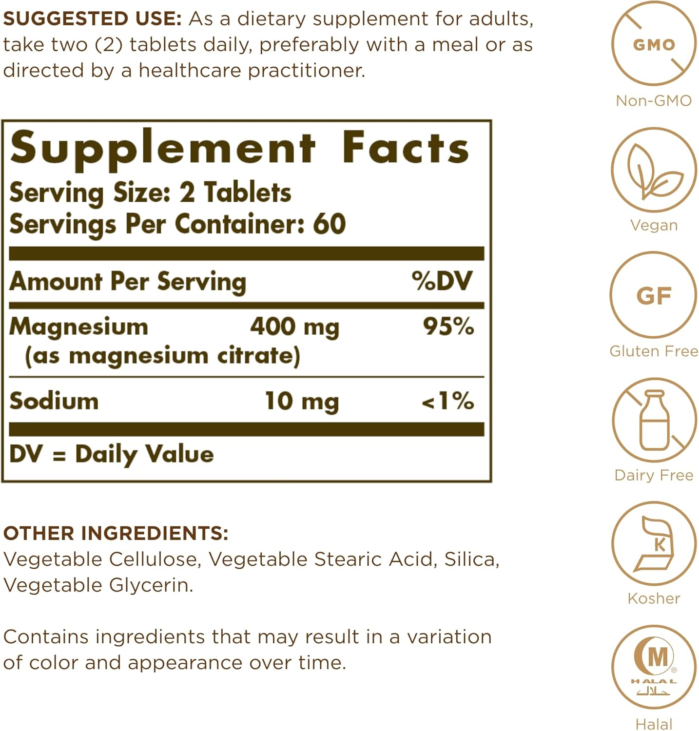 - Non-GMO, Gluten & Wheat Free; Solgar Magnesium Citrate is vegan, kosher, and free of: gluten, wheat, dairy, soy, yeast, sugar, sodium, artificial flavor, and sweetener.