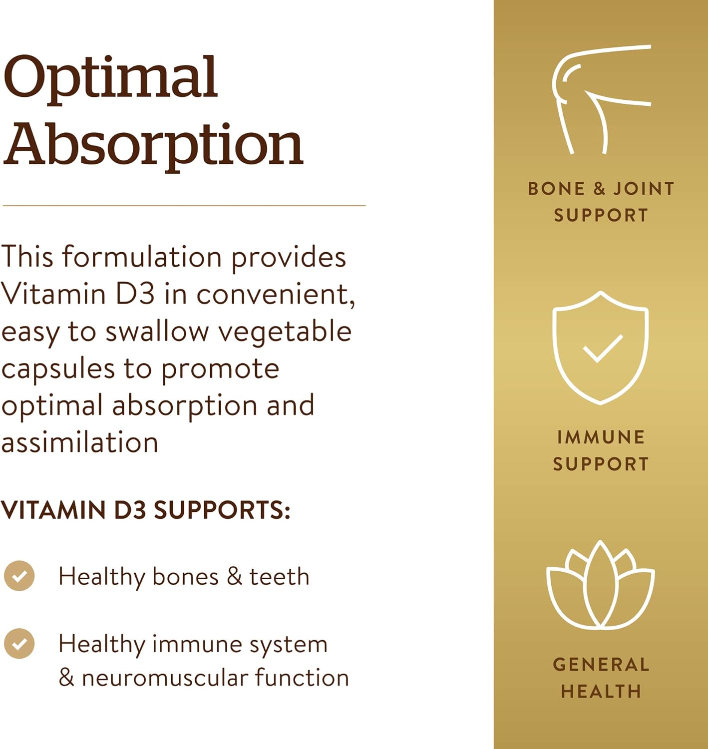 Since 1947 Maintains Healthy Bones & Teeth Supports A Healthy Immune System Certified Gluten-Free Non-GMO Gluten, Wheat & Dairy Free Kosher Parve Dietary SupplementVitamin D is required to promote calcium absorption, which helps to maintain healthy bones and teeth. Vitamin D also supports a healthy immune system. The Vitamin D3 in this product is the same form produced by the body when our skin is exposed to sunlight. As we age, our bodies may produce this important nutrient less efficiently. Th...