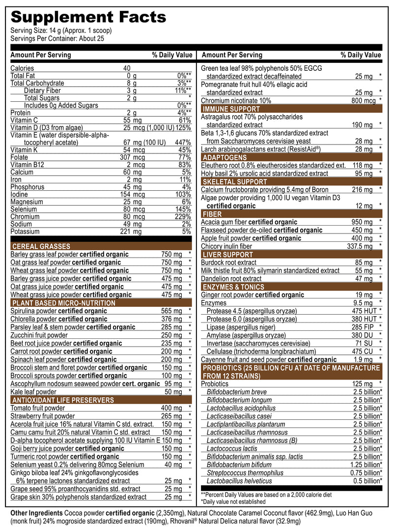 - Comprehensive Superfood Solution: Just 1 scoop packs 65 superfoods, 6 green grass juices, 25 billion probiotics, over 28 mg digestive enzymes, more than 2,100 mg fiber and 213 mg adaptogens, fueling every cell in your body for optimal vitality*
