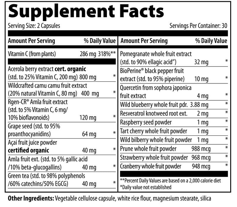 - 100% plant-based vitamin C complex from 18 whole food and fruit extracts