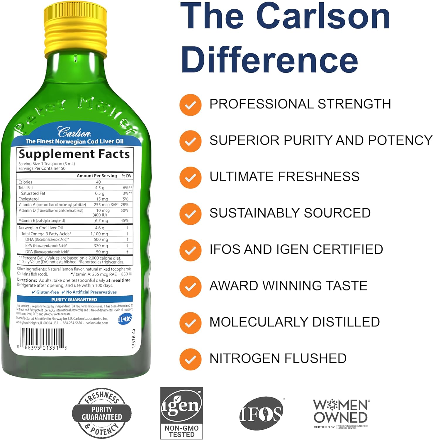 - FRESHNESS, POTENCY, AND PURITY GUARANTEED - Carlson Cod Liver Oil is bottled with a touch of antioxidants and is given a nitrogen flush to remove oxygen and to help prevent oxidation. Like all Carlson omega-3s, freshness, potency, and purity are guaranteed.