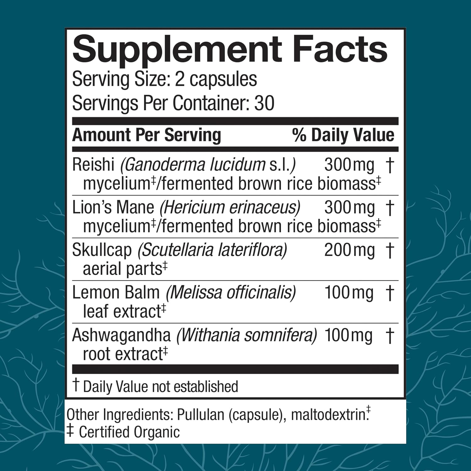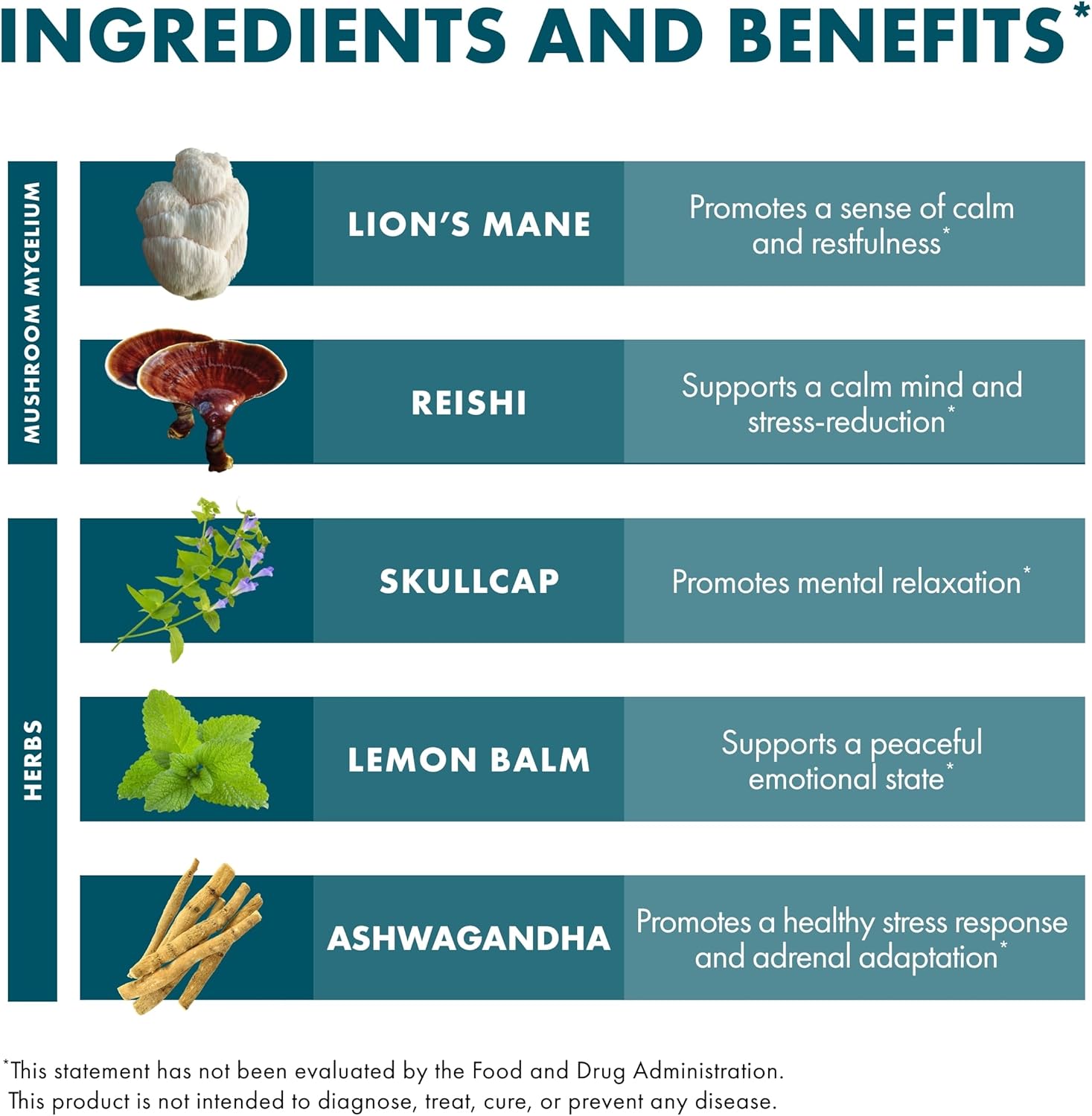 - Powerful Relaxation Formula: This mushroom supplement combines Reishi and Lion's Mane mushrooms with herbs like ashwagandha, lemon balm, and skullcap to promote a sense of calm, support a healthy stress response, and aid relaxation.
