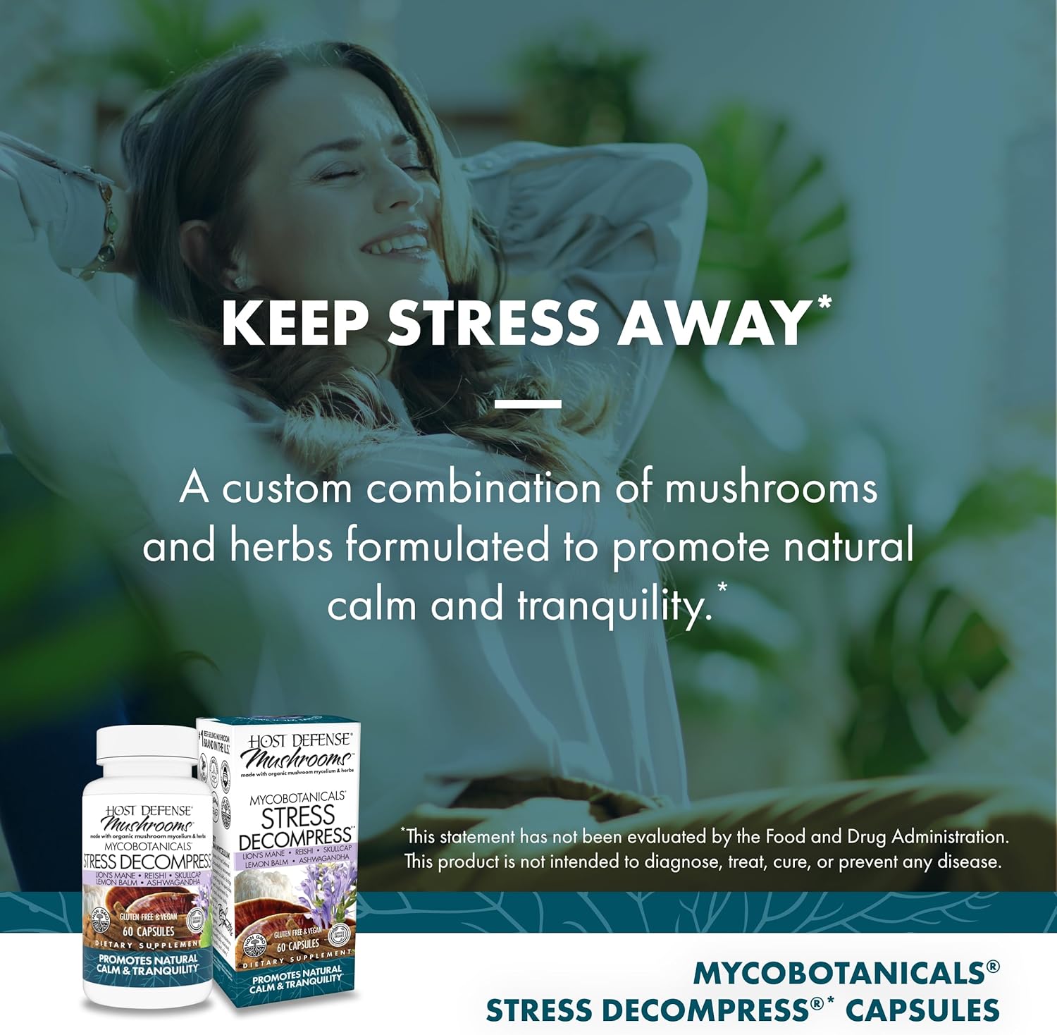 Host Defense MycoBotanicals Stress Decompress* Capsules - Mushroom Supplement with Lemon Balm & Ashwagandha Root - Relaxation Capsules with Reishi, Lion's Man & Skullcap - 60 Capsules (30 Servings)*