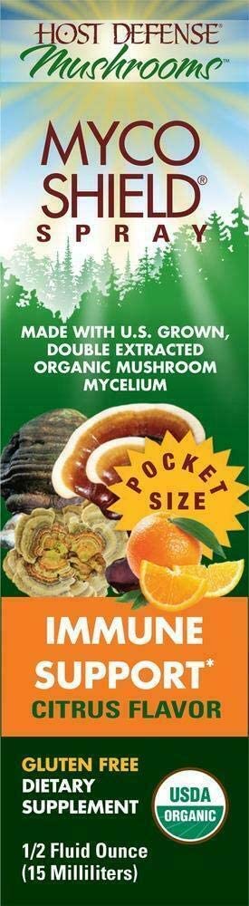 - Host Defense® MycoShield® spray combines five powerful polypore mushroom species: Agarikon, Red Reishi, Chaga, Birch Polypore and Turkey Tail. These five mushrooms provide a unique “shield” of immune support*, available in a perfect traveler’s size. Flavored with certified organic licorice root, MycoShield offers a refreshing taste and is a must-have item for travelers on the go!