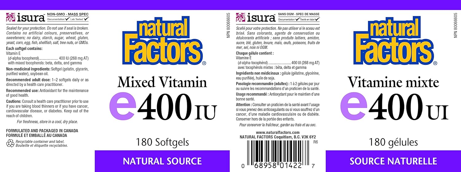 Natural Factors, Mixed Vitamin E 400 IU, Antioxidant Support for Cardiovascular and General Health, 180 softgels